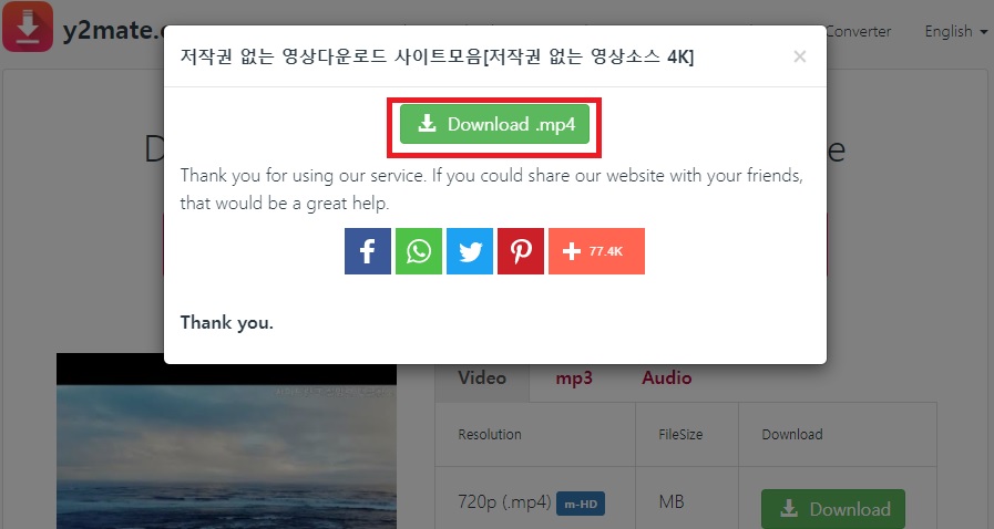 다운로드는 버튼을 누르면 영상의 크기에 따라서 시간이 차이는 있으나 아래와 같이 나옵니다. 이때 다운로드를 눌러주시면 됩니다.