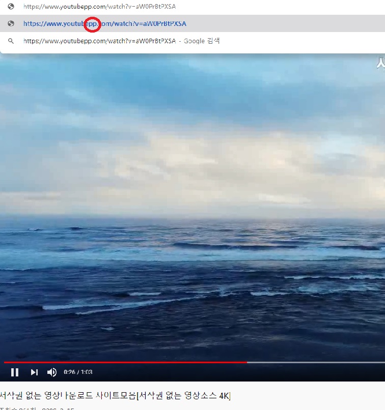 테스트를 위해서 저작권 없는 동영상을 기준으로 설명드리겠습니다. 유튜브에 들어서 다운로드를 원하시는 영상을 재생해줍니다. 그때 웹브라우저 상단 URL 주소가 보일 때 주소창을 클릭합니다. 주소창에서 아래 사진과 같이 "youtube.com/watch.... -> youtubepp.com/wathch..." "pp"를 입력해주시면 됩니다.