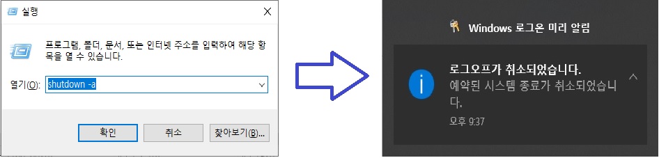설정을 하고 나니까 시간을 바꾸거나 타이머를 꺼야 하는 경우도 있을 겁니다. 이럴 때는 타이머를 취소하고 명령어를 다시 입력하면 되는데, 타이머를 취소하는 명령어도 간단합니다. 실행창에 "shutdown -a" 명령어를 입력하고 확인을 누르면 바탕화면 우측하단 새알림(말풍선 모양)을 누르면 정보가 나오는데 "예약된 시스템 종료가 취소되었습니다."라고 나오면서 타이머가 취소된것을 확인할 수 있습니다.
