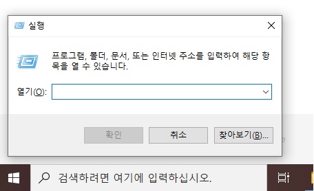 "윈도우키+R"을 누르시면 위에처럼 실행창이 뜨게 됩니다.