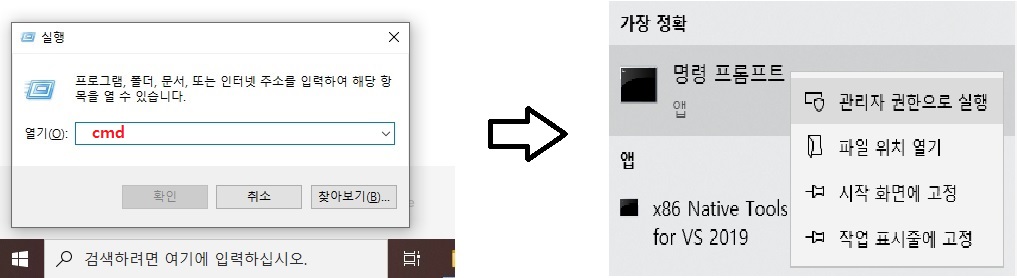 1) 윈도우키+R 을 눌러 실행창을 활성화시킨 뒤 실행창에 "cmd"라고 입력한 뒤 확인-> 명령 프롬프트를 오른쪽 클릭 후 관리자 권한으로 실행합니다.