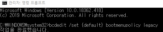 2) 명령 프롬프트에 "bcdedit /set {default} bootmenupolicy legacy"라고 입력 후 재부팅합니다.