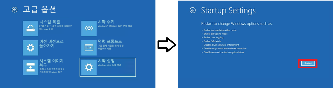 2) 옵션 선택 화면으로 다시 시작된 후 문제 해결 -> 고급 옵션 -> 시작 설정 -> 다시 시작(restart)을 선택합니다. BitLocker 복구 키를 입력하라는 메시지가 표시될 수 있습니다.