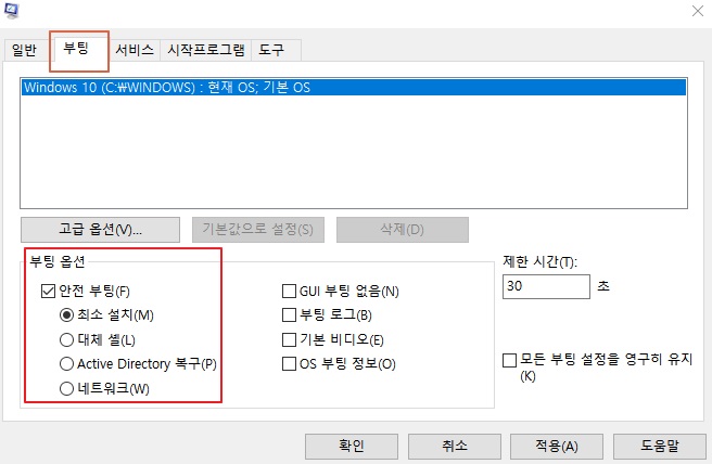 2) 시스템 구성(System Configuration) 창의 부팅 탭 -> 부팅 옵션 선택 원하는 안전 부팅 기능을 체크 적용-> 확인 후 재부팅하면 됩니다. 이 방법을 사용할 경우 매 부팅할 때마다 안전 부팅으로 부팅되니 문제 해결을 하셨다면 정상 부팅으로 되돌아오기 위해서는 꼭 이 "안전 부팅 체크박스를 해제"시켜 주셔야 합니다. 하시는 방법은 위에 순서대로 해시고 부팅에서 안전 부팅을 체크 해제해주시면 됩니다.