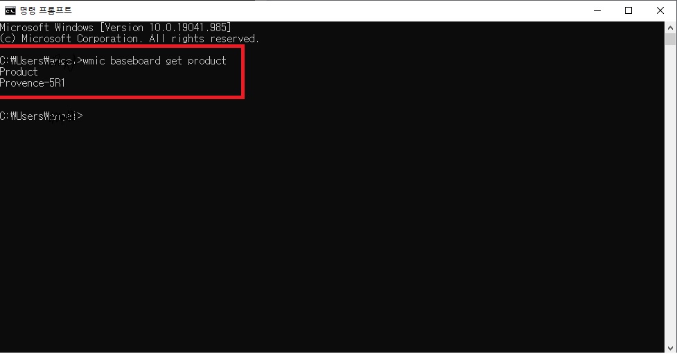 명령 프롬프트 창이 뜨면 "wmic baseboard get product"라고 입력하시고 엔터를 눌러주세요.