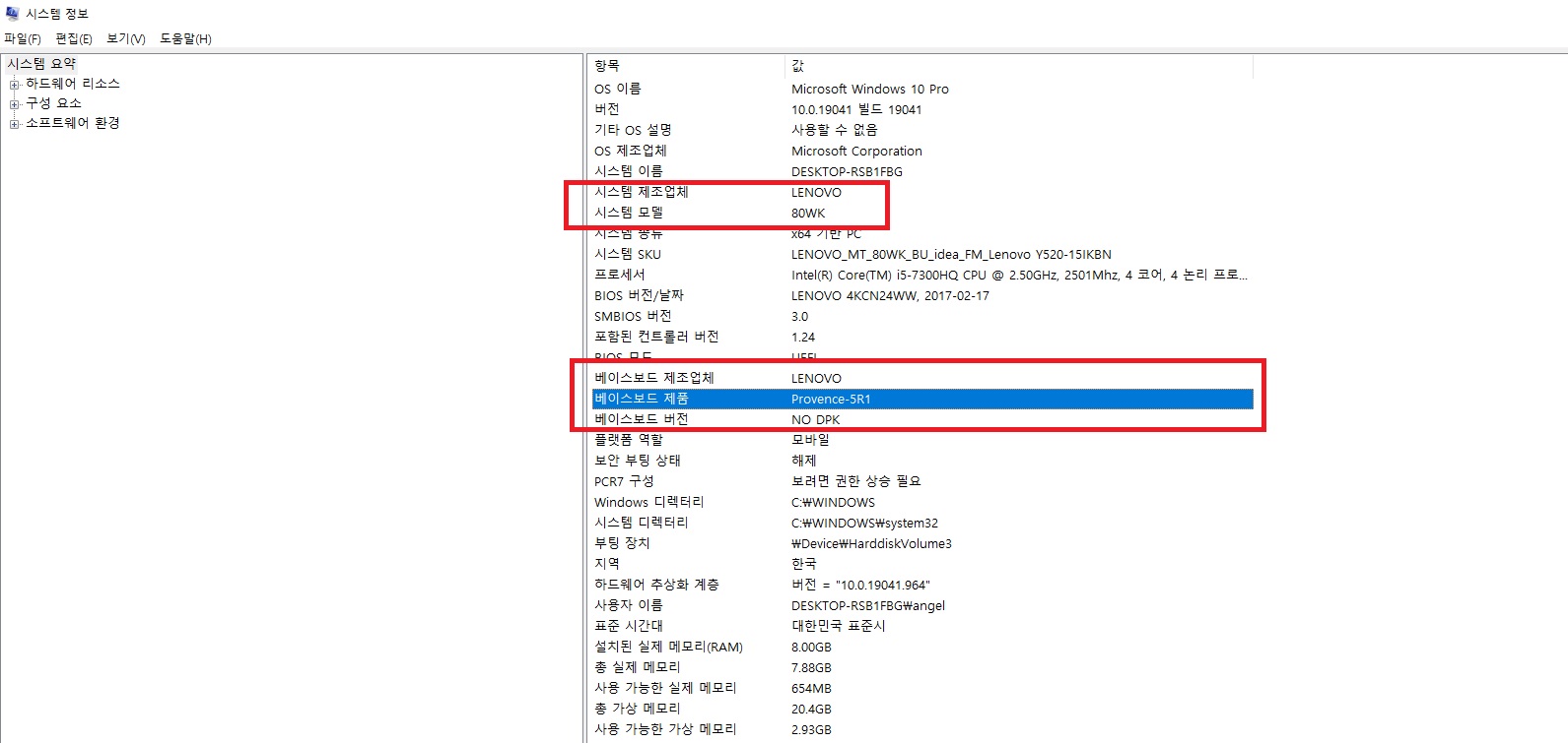 아래와 같이 베이스보드 제조회사, 베이스보드 제품을 확인 할 수 있습니다. 그리고 시스템 제조업체와 모델명 또한 검색이 가능합니다. 시스템 제조업체는 컴퓨터를 만든 회사명이고 시스템 모델은 제품 모델명이며 베이스보드 제조업체는 메인보드 제조업체를 지칭하며 베이스보드 제품이 메인보드 제품명을 말합니다.