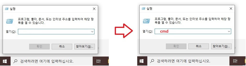 "윈도우키+R"을 눌러서 "실행"창을 켜주세요. 그리고 실행창에 "cmd"를 입력해서 "명령 프롬프트"를 켜주세요.