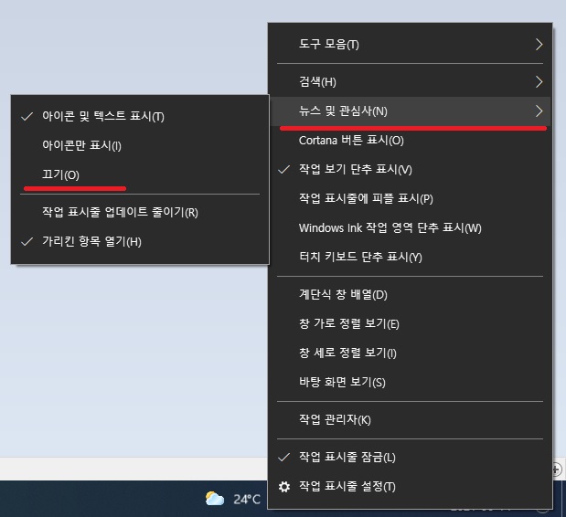 날씨 아이콘 우클릭-> 뉴스 및 관심사 클릭-> 끄기 클릭 을 순서대로 하시면 됩니다.