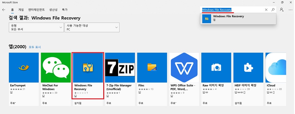 스토어 상단 검색창에 "windows file recovery"를 입력하시고 검색하시면 나오는 3번째 아이콘인 windows file recovery를 클릭하시면 됩니다.