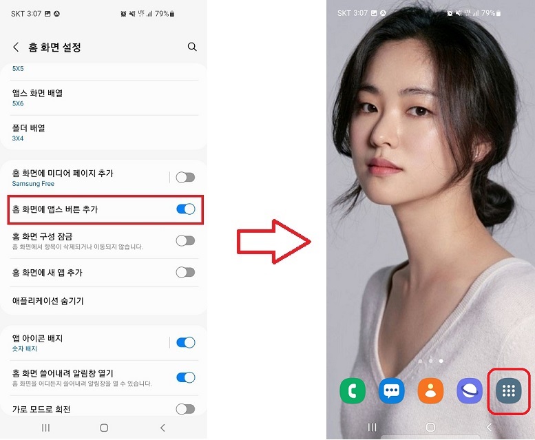 2. "설정"을 누르면 왼쪽 사진과 같이 나오는데 "홈 화면에 앱스 버튼 추가"를 눌러서 사진과 같이 활성화를 시켜주시면 나오시면 오른쪽 사진 하단에 테두리 친 모양의 앱스 버튼이 활성화된 것을 보실 수 있습니다.