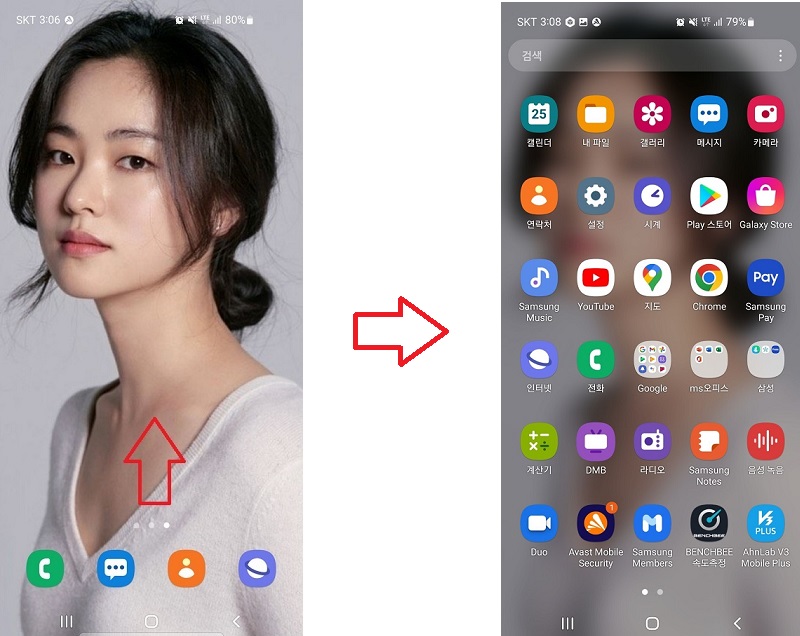 3. 전체 화면을 나오게 하는 방법은 왼쪽 사진처럼 화살표 방향으로 손가락을 쓸어 올려서 전체 화면이 나오게도 하지만 역시 "앱스 버튼" 눌러서 나오게 하는 것만큼 편한 게 없더라고요. 혹시 "앱스 버튼"이 불편하시면 위에 설정에 들어가셔서 "홈 화면에 앱스 버튼 추가"를 비활성화시켜주시면 됩니다.