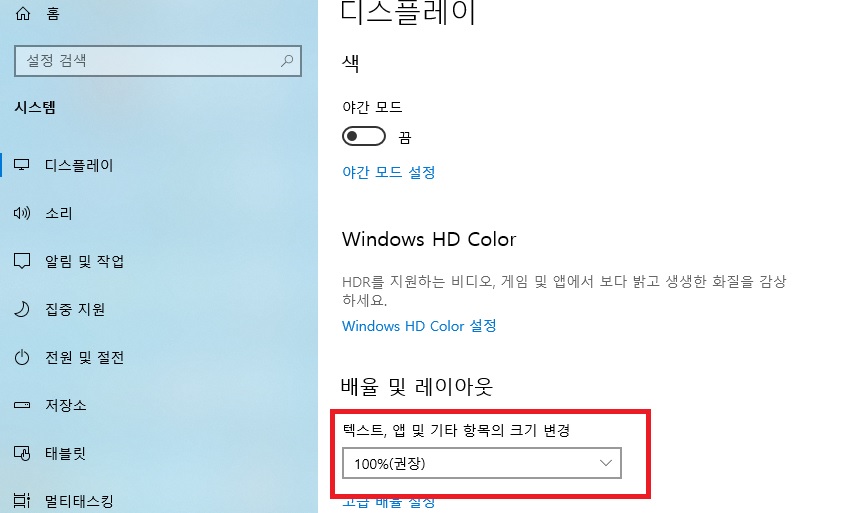 디스플레이 설정 항목에서 배율 및 레이 아웃 항목을 보시면 빨간색 표시된 칸을 보시면 "텍스트, 앱 및 기타 항목의 크기 변경"을 권장사항인 100%로 조정하시면 기본값의 크기로 돌아갑니다. 여기서는 125%, 150%의 크기로 기본값으로 설정하거나 아이콘 크기를 키우기만 조절이 가능합니다. 혹여나 아이콘 크기를 더 키우시거나 줄여야 하는 상황이 있으시면 2번 방법을 이용해서 조절해 주세요.